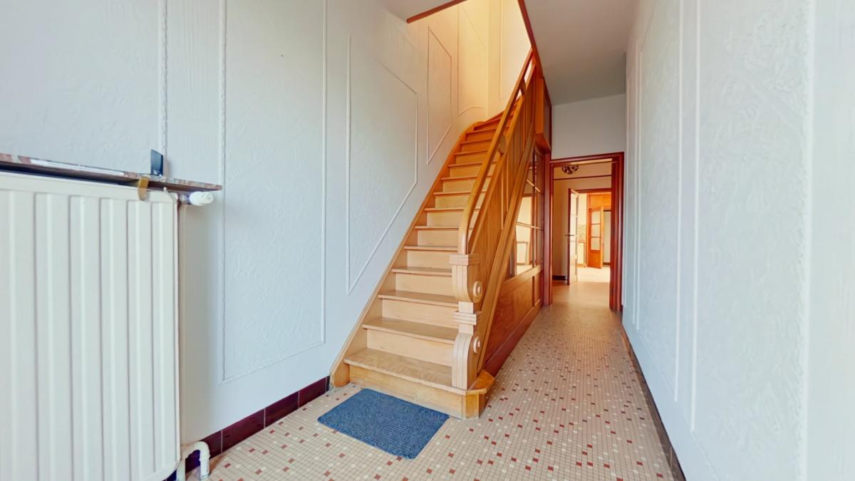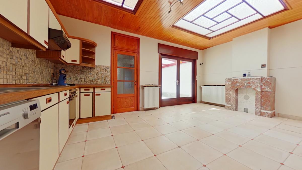 Visite virtuelle Composition: Rez-de-chaussée : - Hall d’entrée de 9 m² (escalier compris) - Espace vestiaire ou bureau de 6 m² - Spacieux séjour de 32,5 m² - Grande cuisine de 24 m² équipée (évier inox avec égouttoir, taque électrique, four, lave-vaisselle, frigo, hotte - Arrière-cuisine de 3 m² - WC de 2,5 m² avec lave-mains - Véranda de 26,5 m² donnant accès au jardin