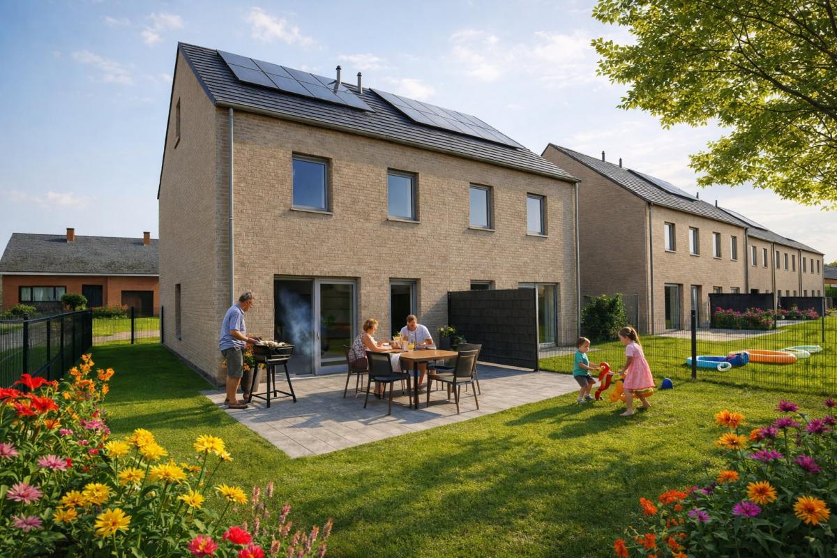 COMPOSITION Rez : hall (+-3,5m²), WC avec lave-main, séjour, cuisine équipée (+-33m²) avec buanderie (+-6m²). 1er étage : hall de nuit (+-6m²), 3 chambres (+-11, 12, 13m²), SDB avec douche (+-7m²), lavabo et wc. Grenier sous combles (+-39m²). Extérieurs : terrasse et jardin – surface habitable : 151m2 INFORMATIONS TECHNIQUES PEB : A - 20250710509237 - 53 kWh/m².an - 7881 kwh/an Égouttage : PVC de diamètre 110 mm. Diamètre de 160 mm depuis la chambre siphonique. Citerne : Eau pluviale : 5000 litres + trop plein vers noue d’infiltration collective. Pré filtre pour la citerne d’eau pluviale. Maçonneries : Portantes en bloc de terre cuite de 14 cm. Bloc d’assise en béton cellulaire. Isolation en PUR de 10 cm (lambda 0,022). Isolation : Entre mitoyens de 2*20mm de laine minérale. Briques Wienerberger Basia Plaza ( WDF – 215*102*65) ton brun et Forum Prata ( WDF – 215*102*65) ton beige avec jointement de 12 mm. Console de reprise de parement au-dessus des châssis en cornières Korbo. Bloc de plâtre pour cloisonnement intérieur. Toiture : Sous toiture, isolant de 22 cm de laine minérale entre chevrons (lambda 0,035 W/mK) et pare vapeur. Tuiles béton (~ 11 pces /m2). Vélux pour les maisons 2 façades. Escalier escamotable. Châssis et portes : Portes et fenêtres en PVC double vitrage. Ug= 1.0. conforme à la PEB. Aérateur dans les fenêtres locaux secs. Membrane d’étanchéité prévue autour des châssis. Seuil en pierre bleue. Murs et plafonds : Enduits au plâtre. PUR projeté de 8 cm (lambda 0,026 W/mK) et chape flottantes. Peinture : Couche de propreté prévue. Sol : Carrelage, Faïences 30/60 cm. Sanitaires : VMC simple flux (extraction locaux humides uniquement). Aérateur dans les fenêtres locaux secs. 2 wc suspendus, lave main, douche, paroi de douche fixe, meuble lavabo, panneau miroir. Chauffage : Chaudière condensation au gaz avec radiateurs avec vannes thermostatiques et thermostat d’ambiance. Production ECS instantanée. Cheminée d’extraction. Panneaux Photovoltaïques : 6 panneaux de 400 Wc. PRIX 295.000€ HTVA + 7.500€ htva (raccordements et frais de géomètre) + commission d'agence de 2% HTVA + honoraires de notaire |