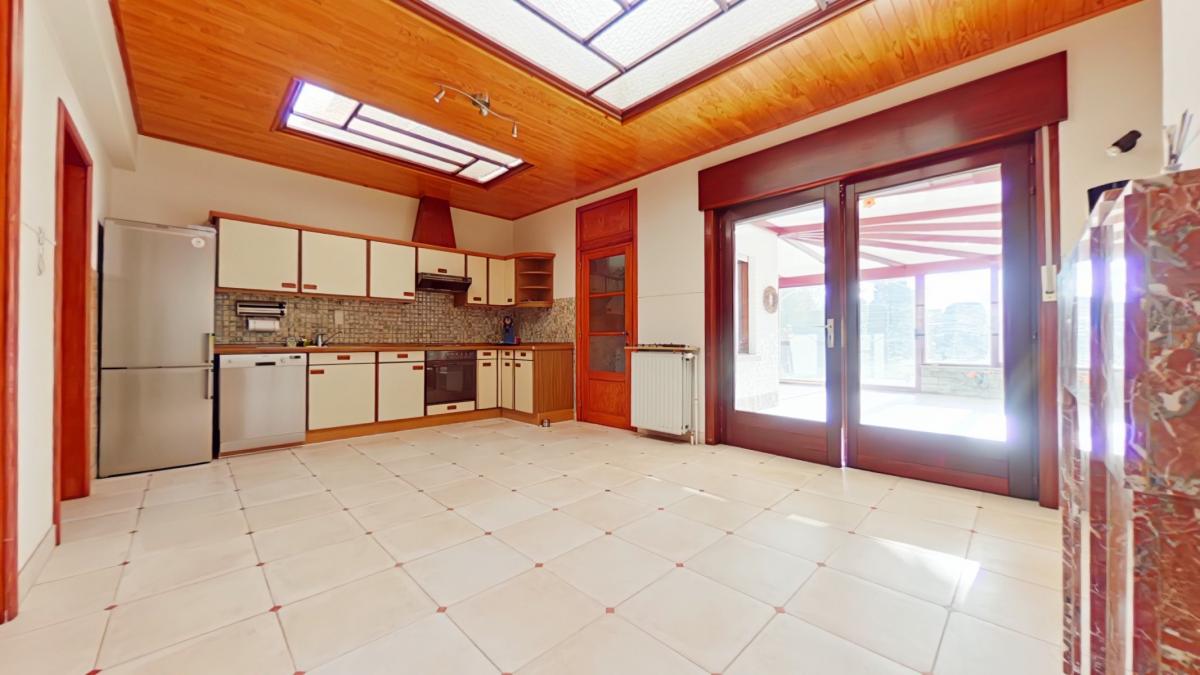 Visite virtuelle Composition: Rez-de-chaussée : - Hall d’entrée de 9 m² (escalier compris) - Espace vestiaire ou bureau de 6 m² - Spacieux séjour de 32,5 m² - Grande cuisine de 24 m² équipée (évier inox avec égouttoir, taque électrique, four, lave-vaisselle, frigo, hotte - Arrière-cuisine de 3 m² - WC de 2,5 m² avec lave-mains - Véranda de 26,5 m² donnant accès au jardin
